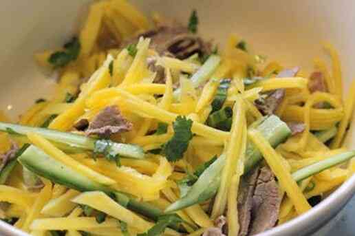 - Cho tất cả hỗn hợp gồm xoài, dưa leo, thịt bò, vào âu sạch