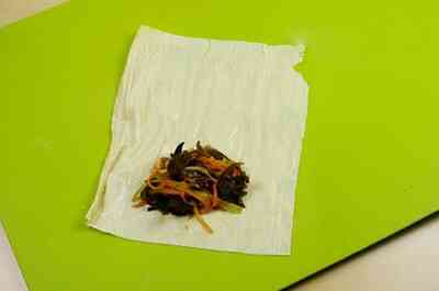| Trải phù trúc ra mặt thớt hoặc đĩa rộng, gắp từng gắp rau xào vào tấm phù trúc rồi cuộn tròn lại. |