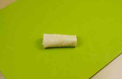 | | Ở mép cuối của phù trúc, miết một ít hỗn hợp bột mỳ (ở bước 5) để tạo độ bám dính tốt. Lặp lại thao tác tương tự với các cuốn phù trúc còn lại. |